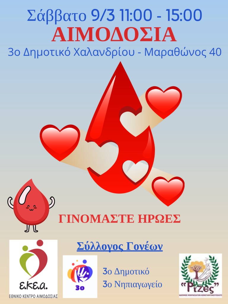 Με ιδιαίτερη χαρά σας ενημερώνουμε ότι ο σύλλογος γονέων του σχολείου μας έκανε εγγραφή στο εθνικό μητρώο αιμοδοτών. Στα πλαίσια αυτής της ενέργειας θα πραγματοποιηθεί η πρώτη εθελοντική αιμοδοσία σε συνεργασία με το ΕΚΕΑ το Σάββατο 9/3 και ωρα 11:00-15:00 στο χώρο του 3ου Δημοτικού Σχολείου Χαλανδρίου. Δημιουργούμε τράπεζα αίματος.